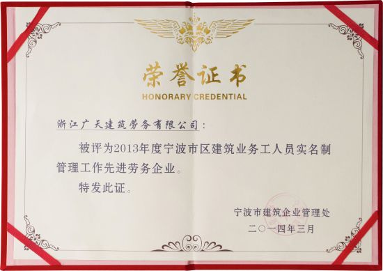 2013年寧波市區建筑業務工人員實名制管理工作先進勞務企業