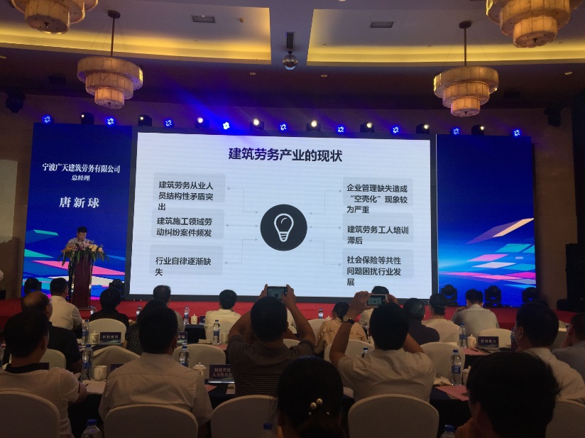 廣天勞務總經理唐新球有幸作為寧波勞務企業家代表作了發言,以“政企合力促轉型,創新平臺引發展”為主題,提出打造以建筑勞務產業園為依托,培養建筑產業工人,打造“互聯網+”勞務用工平臺,抓住建筑勞務產業普遍面臨的痛點,打造一系列服務平臺的思路。