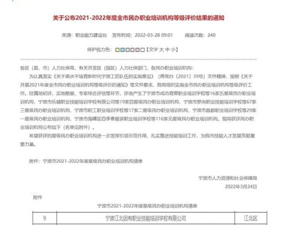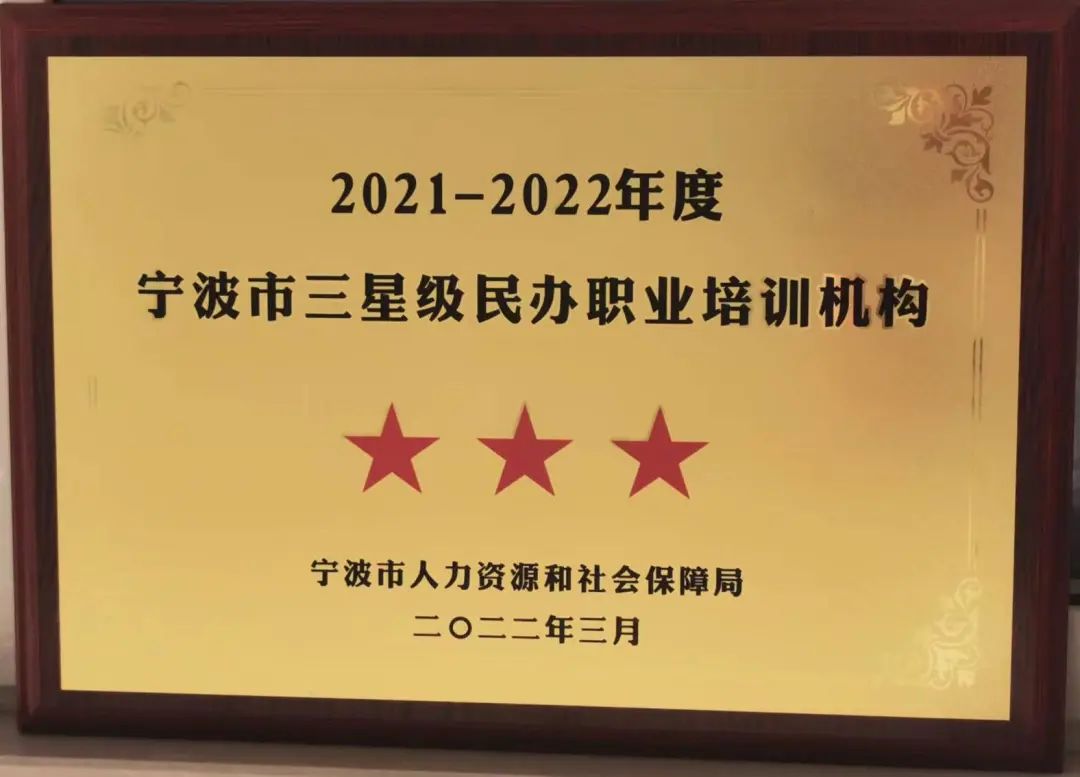 2022年3月24日,廣宜集團(tuán)下屬公司寧波江北因有職業(yè)技能培訓(xùn)學(xué)校獲評三星級民辦職業(yè)培訓(xùn)機構(gòu)。近期領(lǐng)取授牌。