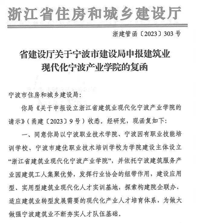 近日,關于設立浙江省建筑業現代化寧波產業學院的請示獲浙江省住房和城鄉建設廳批復同意,標志著寧波市推進建筑業產業學院建設取得突破性進展。